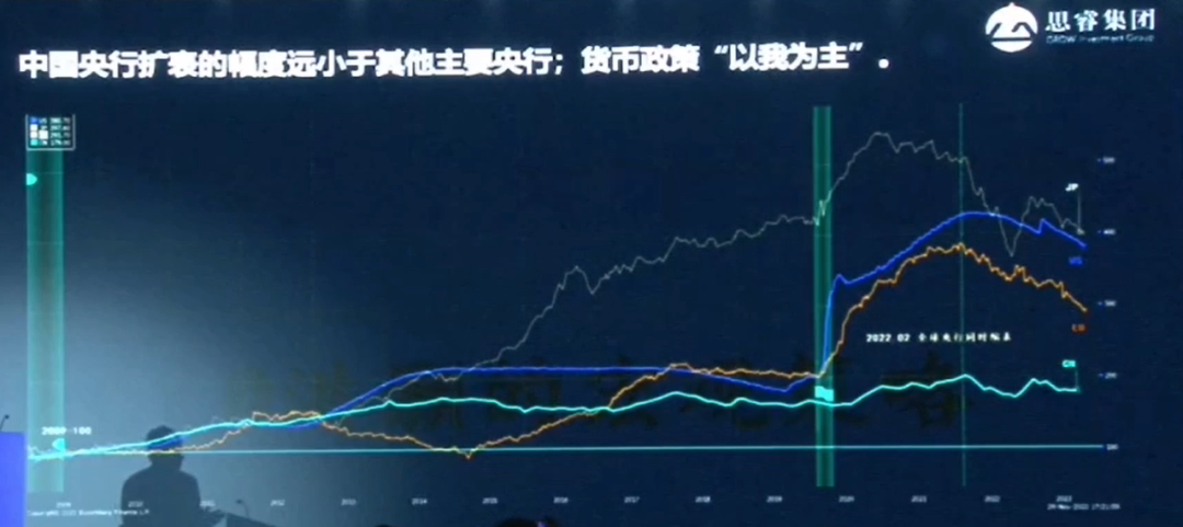 这样的通胀环境再叠加我们央行在过去十几年全球金融危机之后,我们并没有肆无忌惮地放水。然后我们看一下,亮蓝色的线在最下面,它是连欧央行的一半资产负债都不及。因此它给了我们一个非常好的空间做量化宽松。
